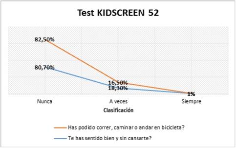 Distribución de los datos según Actividad Física y Salud - KIDSCREEN 52, el Gráfico 4 muestra que el 80.70% de la población se ha sentido que nunca y a veces en relación con el 18.30% mientras que el 1% manifiesta haberse sentido bien; con respecto a si ha podido correr, caminar o andar en bicicleta el 82.50% manifiesta que nunca, el 16.50% manifiesta el 1% manifiesta que siempre lo realiza.