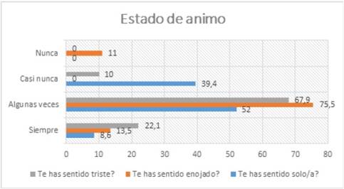 Distribución de la muestra según estado de ánimo. En el Gráfico 5 muestra que el 75.5% manifiesta sentirse algunas veces enojado, el 67.9% algunas veces triste y el 52% se ha sentido algunas veces solo.