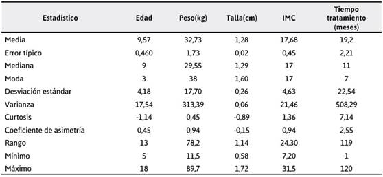 La edad de los pacientes con cáncer infantil oscila entre 2 y 18 años y su promedio es de 9.12. Adicionalmente se obtuvo que el Índice de Masa Corporal de los pacientes es de 17.69, el 25% de los pacientes tienen un IMC igual 14.70 y el 75% tiene un IMC igual a 19.73. (Véase Tabla 2). Analizando a la variable respecto al sexo de los pacientes se encontró que las niñas su IMC promedio es de 17,93 y para los hombres el IMC promedio es de 17,49. Respecto a la antigüedad del paciente se encontró que 58.70% son pacientes recientes, es decir dichos pacientes entraron a tratamiento en el 2019 mientas que la diferencia son pacientes que han estado en tratamiento durante años (41.30%). En promedio los pacientes se encuentran en tratamiento 19,2 meses, como mínimo 1 mes y máximo 120 meses están en tratamiento. Cabe recalcar que el 75% de la muestra se encuentran en tratamiento 21.25 meses.