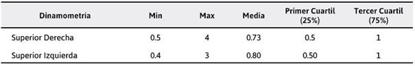 La dinamometría de miembros superiores muestra que para la parte superior derecha se tomó un valor promedio de dinamometría igual a 0.73, además el 25% de los pacientes alcanza un puntaje de dinamometría a lo mucho de 0.50 mientras que el 75% tiene un puntaje de a lo sumo de 1. De la misma manera, parta la parte superior izquierda se determinó que en promedio los pacientes tienen un puntaje promedio de dinamometría igual a 0.80 y además al igual que la superior derecha el 75% de los pacientes a lo sumo alcanza un valor de 1 en la respectiva prueba.
