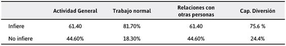 En la distribución de inventario de la breve de la fatiga, tal como se muestra en la Tabla 3, el resultado de este cuestionario muestra que para el 61.40% de los pacientes el nivel de fatiga presentada interfiere en su actividad general, el 81.70% en su trabajo diario normal, 61.40% en las relaciones con otras personas y el 75.6% en su capacidad de diversión.
