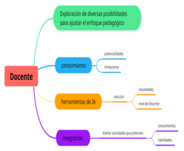 La figura 14 resalta la importancia de que los docentes comprendan a fondo las capacidades y limitaciones de la IA en educación, elijan herramientas adecuadas para sus estudiantes, y empleen la IA de forma efectiva en actividades educativas para enriquecer el aprendizaje y promover el desarrollo de conocimientos y habilidades de manera adaptada y enriquecedora.