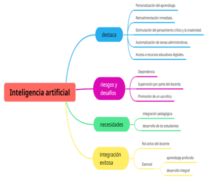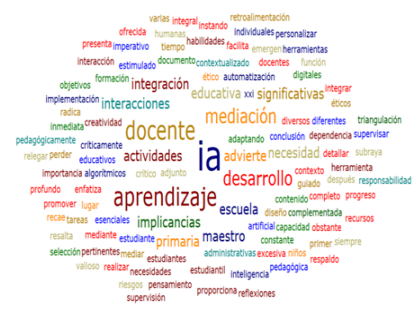 La figura 15 destaca varias implicaciones clave de la integración de la IA en la mediación educativa en la escuela primaria. La IA permite personalizar el aprendizaje adaptando contenidos y actividades a las necesidades individuales de cada estudiante, sin relegar la interacción humana, y ofrece retroalimentación inmediata que complementa las interacciones significativas del docente, estimulando el desarrollo de habilidades del siglo XXI. La automatización de tareas administrativas brinda más tiempo para la mediación pedagógica, pero requiere supervisión humana en la selección y uso contextualizado de recursos digitales. Es necesario que los docentes supervisen críticamente la implementación de la IA, promoviendo un uso ético, y reciban formación para integrarla pedagógicamente. En conclusión, los docentes deben asumir un papel activo al mediar la IA como herramienta de apoyo, sin perder de vista las interacciones y reflexiones humanas esenciales para un aprendizaje profundo y el desarrollo integral de los estudiantes.