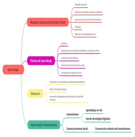 En el proceso de aprendizaje en la escuela primaria, se adquieren conocimientos, habilidades y valores de forma dinámica y activa. Los estudiantes construyen su propio conocimiento al participar activamente, mientras la mediación educativa facilita este proceso con apoyo y actividades orientadas a sus objetivos. El aprendizaje se vincula con las necesidades de los estudiantes, fomentando autonomía, toma de decisiones y conexión con teorías como el conectivismo y el construccionismo social, que exploran el aprendizaje contemporáneo en red y la construcción colectiva del conocimiento.