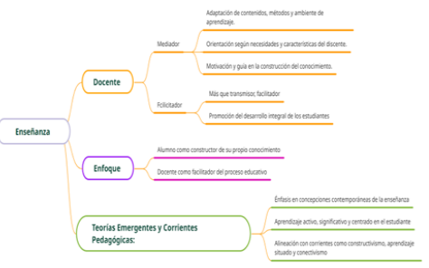 A partir de los elementos mostrados en la figura 3, se entiende la enseñanza en la educación primaria se concibe como un proceso complejo de mediación educativa, donde el docente, actuando como facilitador, implementa estrategias pedagógicas para generar aprendizajes significativos. El enfoque se centra en el alumno, sus necesidades y características, privilegiando una pedagogía que promueve el desarrollo integral a través del aprendizaje activo, significativo y participativo. Esto se alinea con teorías emergentes como el constructivismo, el aprendizaje situado y el conectivismo, que conciben al estudiante como constructor de su propio conocimiento y al docente como guía de ese proceso.