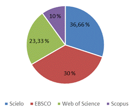 Seguidamente en la siguiente grafico 1, se observa que la base de datos EBSCO, permitió recolectar la gran parte de artículos científicos, por lo que equivale al 30% del total. A diferencia de WoS que obtuvo un porcentaje representativo de 23,33%, de Scopus fue un 10% y los que permanecieron a Scielo se obtuvo el 36,66%.