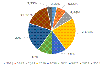 Por otro lado, en cuanto al año de publicación se puede apreciar en gráfico 1, el año donde se identificaron más publicaciones sobre el tema de interés es el 2019 (23,33%) y luego le sigue el 2022 (20%). En este sentido, es necesario destacar que, en los últimos cinco años, la pedagogía ha experimentado un marcado cambio y una rápida evolución impulsada principalmente por el avance tecnológico y la globalización.