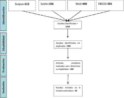 Luego de realizar la búsqueda fueron obtenidos 1250 artículos de Scopus, EBSCO, Scielo, WoS y al aplicar los criterios de inclusión y exclusión señalados finalmente se incluyeron en la base para la realización de la investigación 30 artículos. En la figura 1, se muestra el flujograma de todo el proceso.