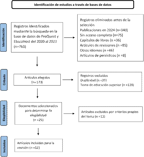 La metodología desarrollada para este estudio se dio por medio de la revisión sistemática. Para la búsqueda de la información se utilizaron las bases de datos de revistas indexadas en ProQuest y EbscoHost y que correspondan a los años del 2020 al 2023. Asimismo, la recolección de datos se dio por medio del modelo PRISMA (Elementos de Reporte Preferidos para Revisiones Sistemáticas y Metaanálisis) propuesta por (Rethlefsen et al., 2021), como guía para planificar y llevar a cabo la revisión sistemática.