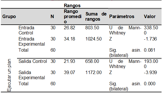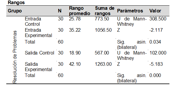 En la prueba inicial, los resultados entre el GC y GE fueron similares. En la prueba final, el GE mostró mejoras significativas en la ejecución del plan, solución del problema y redacción de la solución. El valor de significancia estadística p=0.000, menor a α=0.05, llevó a rechazar la hipótesis nula y aceptar la hipótesis de investigación.
