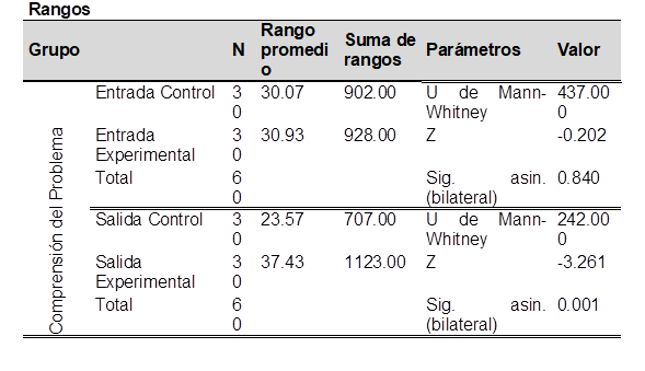 En los resultados de la prueba inicial, el GC y el GE mostraron resultados similares. Sin embargo, en el test posterior, el GE demostró una mejor comprensión del problema, utilizando técnicas como el subrayado e identificando datos explícitos e implícitos. El valor estadístico p=0.001 indica una significancia menor al nivel α=0.05. Por lo tanto, se rechaza la hipótesis nula y se confirma la hipótesis de investigación.