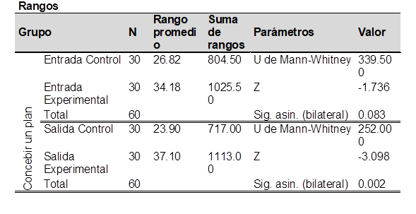 En la prueba inicial, los resultados del GC y GE fueron similares. En la prueba final, el GE mostró mejoras significativas al realizar esquemas, elaborar estrategias y dividir el problema en partes. El valor de significancia estadística p=0.002, por debajo de α=0.05, llevó al rechazo de la hipótesis nula y la aceptación de la hipótesis de investigación.