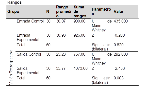 A continuación, se presentan los resultados de la Prueba de la U de Mann-Whitney (tabla 1) para la hipótesis general.