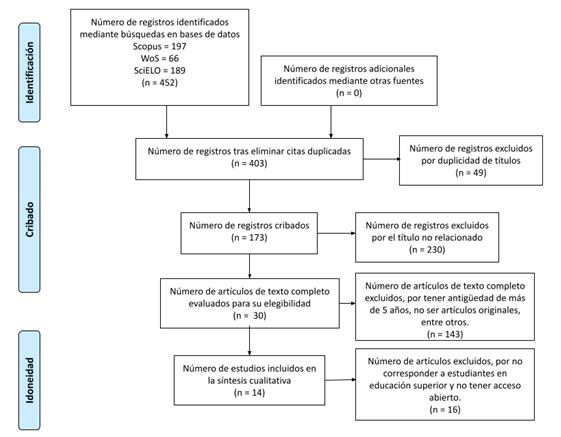Se identificaron un total de 452 artículos, de los cuales 197 corresponden a bancos de datos de Scopus, 66 a Web of Science y 189 a SciELO. Durante el cribado se descartaron 49 artículos por duplicidad hallados en las bases de datos Scopus y Web of Science; asimismo se eliminaron 230 artículos debido a que el título no correspondía con lo propuesto para quedar con 173 artículos. En cuanto a la idoneidad se retiraron 143 artículos por exceder más de cinco años de antigüedad y no ser artículos originales, dejando 30 artículos. Finalmente, luego de un análisis minucioso quedaron 14 artículos para el estudio sistemático; todo este proceso se evidencia en la figura 1.