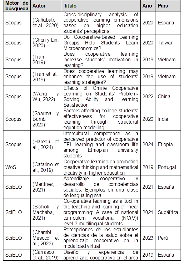 Se aplicaron los criterios de inclusión tomando en cuenta los artículos originales publicados desde el 2019 al 2024 escritos tanto en idiomas inglés como en español con acceso abierto en las bases de datos de Scopus, Web of Science (WoS) y SciELO; referidos al aprendizaje cooperativo y a los estudiantes de educación superior, alta o universitaria; como criterios de exclusión se elimina los artículos publicados antes del año 2019, escritos en idiomas distintos al inglés y español, así como el uso de bases de datos distintas a Scopus, Web of Science y SciELO, temas distintos al título del artículo presentado, así como a estudiantes de nivel educativo básico o medio y sus equivalentes que no sean de educación superior y la duplicidad de títulos de artículos.