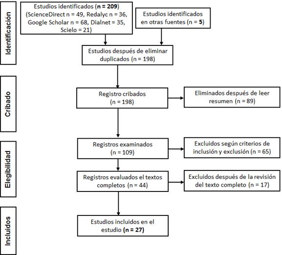 Los documentos se organizaron y registraron de acuerdo con lo que establece la guía actualizada PRISMA (Preferred Reporting Items for Systematic Reviews and Meta-Analyses), que abarca las etapas de identificación, cribado, elegibilidad e inclusión. La figura 1 ilustra el flujo de información durante este proceso de selección, desde la identificación inicial de 214 registros hasta que finalmente se incluyeron 27 estudios.