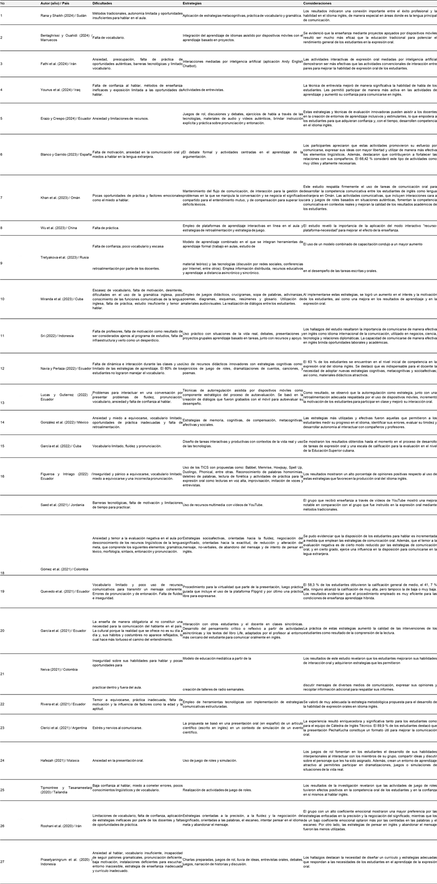 En la revisión sistemática realizada, se analizaron un total de 27 artículos en los que se estudiaron las dificultades que presentan los estudiantes universitarios en el desarrollo de la expresión oral en inglés como lengua extranjera y las estrategias que se han implementados para mejorar esta habilidad. Según su año de publicación, 5 trabajos correspondieron al 2024, 5 al 2023, 6 al 2022, 8 al 2021 y 3 al 2020. Esta información evidencia que se trata de un tema de estudio activo y de interés dentro de la comunidad científica.