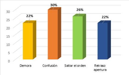 Como se observa en la figura 1 la mayor queja y reclamo es por la confusión en la entrega del pedido que solicitaron, el 30% de los clientes manifestaron esa situación; por otro lado, el 26% menciona que presentaron quejas acerca de no respetar el orden del pedido, asimismo, el 22% menciona que existen demoras en cuanto a la entrega del producto, y el restante 22% indica que presentó quejas y reclamos sobre el retraso en la apertura del local.