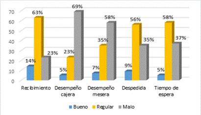 En la figura 2 se observa que el 63% de los clientes consideran que el recibimiento al local es regular, 23% malo y 14% bueno; al preguntar por el desempeño de la cajera el 69% piensan que es malo, 35% regular y 7% bueno; con respecto al desempeño de la mesera, los clientes que consumen dentro del local, lo califican el 58% malo, 35% regular y 7% bueno; en cuanto a la despedida del local los clientes declaran que fue regular 56%, malo 35% y bueno 9%; al considerar el tiempo de espera para la prestación del servicio los clientes respondieron el 58% regular, 37% malo y 5% bueno.