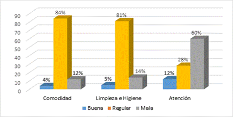 La calificación en cuanto a la atención recibida el 60% la califican como mala, el 28% regular y el 12% buena. Con respecto a la limpieza e higiene del local el 81% de los encuestados piensan que es regular, 14% mala y 5% buena. Al considerar la comodidad, para el 84% es regular, el 12% mala y el 4% buena.