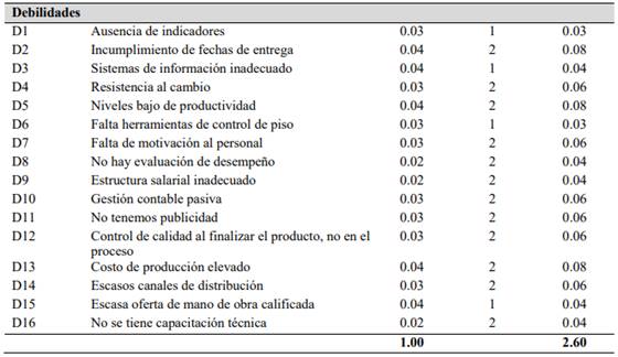 De igual forma, en los resultados de la matriz FODA (tablas 2 y 3), las oportunidades y amenazas son los factores externos y las fortalezas y debilidades los factores internos. El peso adjudicado a un factor dado indica la importancia relativa del mismo para alcanzar el éxito de la empresa, El Peso: 0.0 (no importante) a 1.0 (absolutamente importante). La calificación indica el grado de eficacia con que las estrategias de la empresa responden a cada factor. Debilidad mayor = 1, Debilidad menor = 2, Fuerza menor =3, Fuerza mayor = 4.