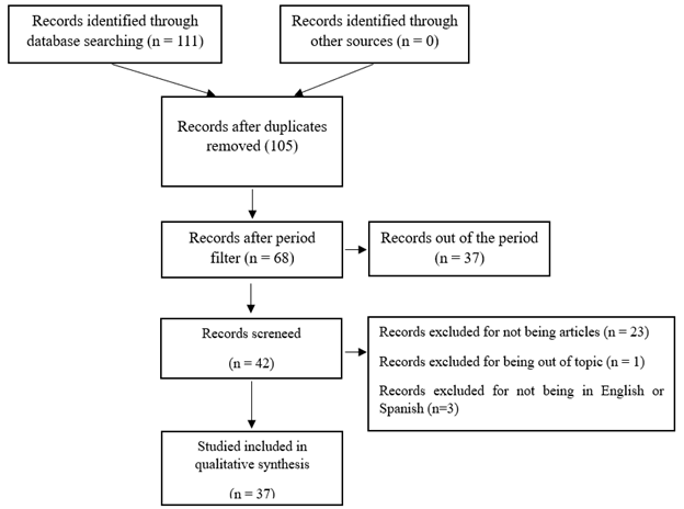 El proceso de selección siguió una lógica secuencial por etapas. En la fase inicial de identificación, se localizaron 111 documentos potenciales. Posteriormente, durante la etapa de cribado, se eliminaron aquellos artículos duplicados, irrelevantes o sin información suficiente en sus resúmenes, reduciendo el corpus a 105 textos. En la tercera etapa, se aplicó el filtro de fecha, así como el de tipo de documento, el cual tenía que ser artículo y encontrarse dentro de las subáreas de Business, Management and Accounting, Economics, Econometrics and Finance, Social Sciences y Decision Sciences los cuales constituyen la base analítica de esta revisión, así como la exclusión de todos aquellos trabajos que no se encontrasen en inglés o español, seleccionándose así 42 documentos. Finalmente, fueron seleccionados 37 artículos que cumplían con todos los estándares de pertinencia y calidad, luego de realizarse una lectura completa de cada uno de estos artículos, lo que permitió descartar los otros 5 trabajos que no cumplían los criterios establecidos.