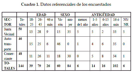 Las preguntas 1 a 5 permitieron conocer a la población encuestada en datos de edad, sexo, sector, municipio y antigüedad en su representación. Como se observa, las variables de referencia han sido ampliamente equilibradas. La representación por sector social no fue notablemente desequilibrada, la diferencia entre los sectores más y menos encuestados es de 4 boletas. En representación por género, aunque no hubo absolutamente ningún tipo de depuración administrativa ni preselección, sorprende positivamente que un 58.3 por ciento de encuestadas sean mujeres; empero, la presencia de varones es absoluta en el sector del transporte. Respedo de la edad de los encuestados, hay un peso notable en el rango de 26 a 45 años, los que constituyen el 55 por ciento (79 personas); un 27 por dentó (39 personas) están entre 18 a 25 años; finalmente, los mayores a 46 años son el 18 por dentó.