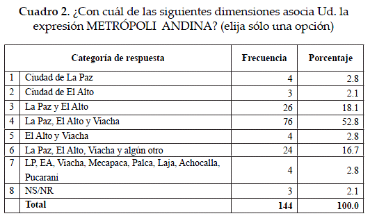 •  La cuarta, la que en este documento se desarrolla, es un informe de los resultados del trabajo de campo realizados en base a una encuesta entre actores sociales metropolitanos, respecto de sus percepciones sobre un eventual proceso de institucionalización de la metrópoli andina de La Paz.