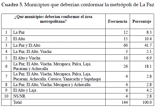 Llama enormemente la atención que más de un 40 por ciento de los encuestados cree que la metrópoli debería estar conformada sólo por La Paz y El Alto, en tanto que en un distante segundo lugar (18 por ciento) aparecen los ocho municipios que, ipso facto, han constituido en los últimos años mesas de diálogo para la constitución de la Metrópoli Andina de La Paz. Aquí también se revela que sólo un tres por ciento estaría de acuerdo en una base más amplia que incorpore a Yanacachi, Coroico y Sapahaqui.