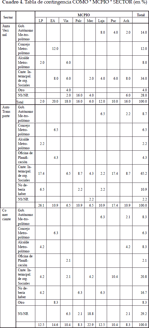El cuadro 4 expresa la convergencia de la pregunta ¿Cómo cree Ud. que debería funcionar un gobierno o administración metropolitano andino? por municipio y sector. Se observa que dos de los tres sectores coinciden en un mayoritario "Comité Intermunicipal de Organizaciones Sociales". Sólo en el sector del comercio, la opción más votada fue "No sabe / No Responde". Respecto a la segunda opción de preferencia en los sectores sociales, para el sector de juntas vecinales fue "No sabe / No Responde"; para el autotransporte fue "no debería haber"; para el sector del comercio fue "Comité Intermunicipal de Organizaciones sociales". De entre las opciones vinculadas a un proceso de institucionalización de la Metrópoli (Gob. Autónomo Metropolitano, Concejo Metropolitano, Alcalde Metropolitano) en el sector vecinal y el sector del autotransporte "gobierno Autónomo", tuvo mayor preferencia respecto de las otras dos; para el sector de comerciantes la preferencia fue en igualdad para "Gobierno Autónomo Metropolitano" y Alcalde Metropolitano. Finalmente, la opción "no debería haber" aparece entre autotransportistas y comerciantes, no así entre dirigentes vecinales.
