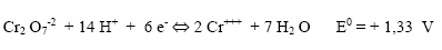 Donde el alto potencial del ión dicromato permite catalogarlo como un oxidante fuerte, de hecho en el análisis de Fe+2 la diferencia de potencial para la reaccion redox por dicrometria es ΔEº = Eº(Cr2O7-2 /Cr+3 ) – Eº(Fe+3 / Fe+2) = +1,33 - 0,771 V = +0,559 V, (que permite calcular la constante de equilibrio K de 10 57) sugiere la espontaneidad de la reacción.