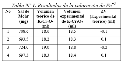 Se ha valorado por cuadruplicado Fe+2 a partir de masas mm definidas de sal de Mohr (Tabla No. 1) disueltas en ácido clorhídrico, en presencia de H2SO4, H3PO4, con solución de dicromato de potasio estandarizada de una concentración de 0,0962 N. La desviación estándar de σn-1 ±0.2, esto lleva a un error del orden del 1% en las medidas de concentración del Fe+2.