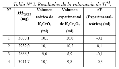 El procedimiento es similar al caso anterior, se ha utilizado masas de TiClen solución (Tabla Nº 2), La desviación estándar de σn-1 ±0.2, esto lleva a un error del orden del 1% en las medidas de concentración del Ti+3.