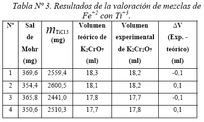 Se ha desarrollado la evaluación conjunta de Fe+2 y Ti+3, mezclando por cuadruplicadas masas de la sal de Mohr y de TiCl (Tabla Nº3), disolviendo la mezcla completamente con ácido clorhídrico, se ha regulado el medio con H2SO4 y H3PO4, desarrollándose la valoración con dicromato de potasio (0,0962N). La desviación estándar de σn-1 ±0.1, permite proponer un error del orden del 1% en las medidas de concentración del Ti+3.
