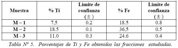 Los análisis por triplicado ha sido desarrollados para la muestra M – 1 en la fracción no magnética, en la M – 2 y M – 3 en la fracción magnética. Los métodos de análisis han sido los anteriormente estandarizados, teniendo los cuidados adecuados para llevar el Fe (III) y Ti (IV) a sus estados reducidos de Fe (II) y Ti (III) con amalgama de Zn. En la tabla Nº 5 se observa los % de Ti y Fe obtenidos en las diferentes muestras analizadas, encontrándose evidencias de los mayores contenidos de Fe y Ti para la muestra M – 2, seguida de la muestra M – 3, y bajas concentraciones de estos elementos en la muestra M – 1.