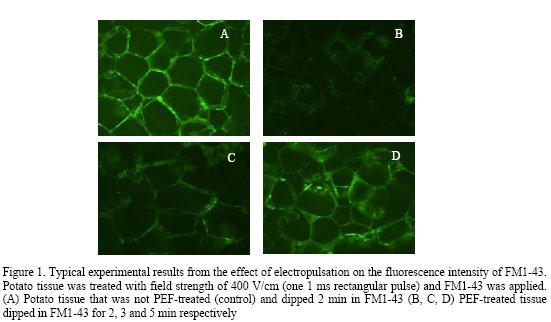 In Figure 1a-d, typical microscopic observations of the fluorescent interaction of the dye with the cell membrane after PEF application are shown. Figures 1a and b show a dramatic decrease of the fluorescence intensity of the PEFtreated sample in comparison with that of the control. The fluorescence intensity is progressively restored when increasing the dipping time of the potato slice in FM1-43 from 2 to 5 min (Figures 1c, d), showing that PEF treatment has affected the rate of diffusion of the dye through the extracellular space, slowing the staining process.