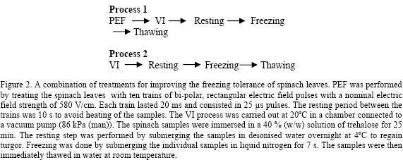 A comparison between process 1 and 2 in Figure 2 reveals that improving the freezing tolerance of spinach leaves could be achieved only when the VI process was used in combination with PEF.