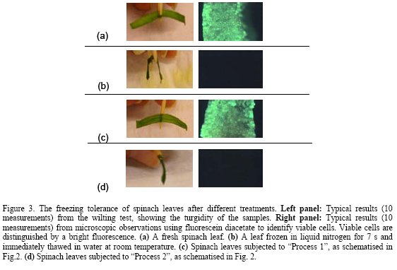 Figure 3 shows the results where it is demonstrated that the tested procedure (Process 1 in Figure 2) resulted in viable, turgid spinach leaves.