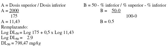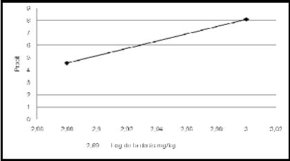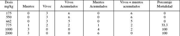 El método gráfico de Probit muestra 2,89 del Log de la dosis por lo tanto la DL50 es de 776,25 mg/kg (Figura1)