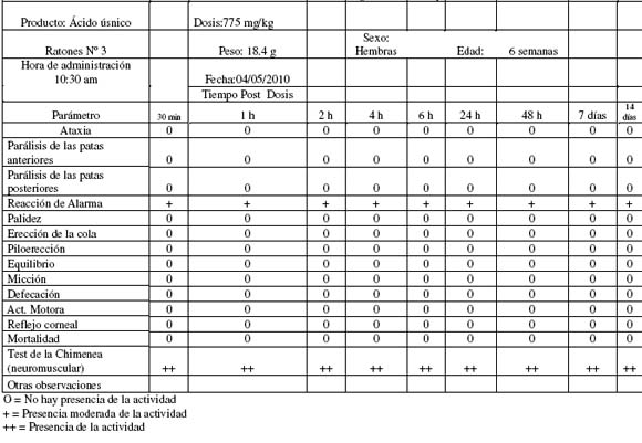 La evaluación incluyó la relación que puede existir entre los ratones tratados y grupo control que recibió el vehículo (agua), observándose la incidencia y severidad de respuestas anormales clínicas y de comportamiento y si estas son reversibles, cambios en el peso corporal, mortalidad y cualquier otro efecto tóxico. Los ratones fueron observados individualmente a los 30 min, 1 hora, 2 horas, 4 horas, 6 horas, 24 horas, 48 horas, 7 días hasta los 14 días. Las observaciones están dirigidas a la determinación de: muerte y tiempo de ocurrencia de la misma, signos y síntomas de toxicidad: Ataxia, parálisis de patas anteriores y posteriores, alarma, piloerección, equilibrio, palidez, erección de la cola, actividad motora, reflejo corneal y mortalidad. El test de la chimenea está dirigido para evaluar actividad neuromuscular, incluyendo su inicio y duración, además se controla el peso de los ratones durante el ensayo.