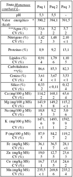 The fruits of the vegetal species Hymenaea courbaril L. were surveyed. This is a species known in the Bolivian Amazonian region under the common name of paquio. The fruits were collected at Ixiamas village and their surroundings in the province Abel Iturralde, Alto Beni, and at Mapiri village, department of La Paz. In the investigation of the eatable part of the fruit, a bromatological preliminary study was carried out. The macro and micro nutrients were determined, as well as the taste of the handmade elaborated products. A preliminary phytochemical study an the antioxidant capacity was also performed in fruits.