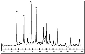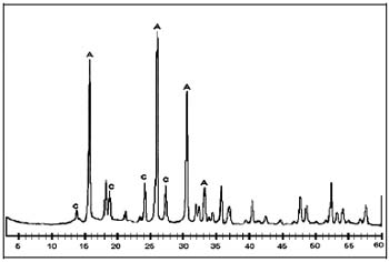 Figura No. 1. Espectro de DRX de un producto del tipo MA3. Donde: A; es un material tipo analcima. C; es un material tipo cancrinita