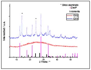Asimismo de pretendió sintetizar un material zeolitico a menores temperaturas hidrotermales. La Figura No. 5 muestra los DRX de las muestras GV2 y GV3.