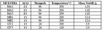 Tabla No. 1. Condiciones de síntesis de zeolitas.