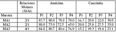 Los resultados de la Tabla No. 2 muestran que la fase MA3 presenta como fase mayoritaria a la analcima en un 85%.