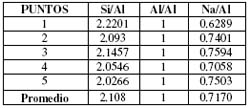 Los resultados de la Tabla No. 2 mediante difracción de rayos X (DRX) nos permiten observar la caracterización de estos materiales, en cuya mezcla existen picos máximos asignados a las fases del tipo analcima y cancrinita.