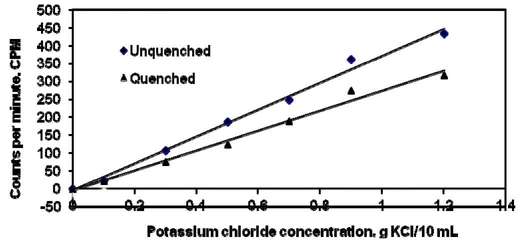 At zero quencher concentration, counting efficiency E average out to 55%. Background data B has been determined before each series giving 55 CPM in average. In spite of a low value of so called Figure of Merit, (E2/B) =55, it can be improved by increasing the KCl concentration and hence the counting efficiency E.