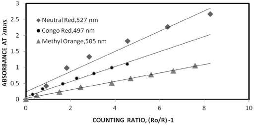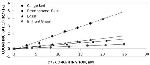 According to data, a high dye concentration does not cause further decrease of counting rate. Moreover, low counting rates due to high dye concentration would be an additional source of uncertainty. Detection limits considered as the lowest concentrations which can be detected, are roughly 2 or 3 p.p.m. A high detection limit belongs to the Crystal violet. The linear range column indicates the upper limit of concentration range with a correlation coefficients near 0.9990. Table 2 summarizes these parameters. This quenching technique not only has low detection limit, but also has good calibration linear relationships. Prepared standard solutions measured as