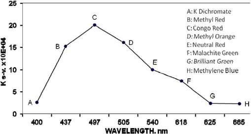 Figure 4 illustrates µÂ¿-f constants as a function of maximum of visible light absorbance wavelengths of chosen dyes or compounds, and resembles a spectrum. However, it only shows that Congo red is the best quencher of Cerenkov photons than the other ones.