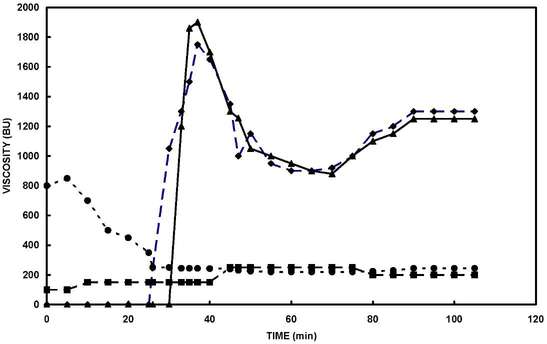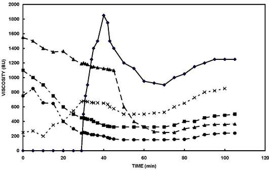Figure 2. Amylographs of native and drum dried starches with different water: starch ratios. Native â¦, drum-dried 1:1 and 6 rpm x, drum-dried 1.25:1 and 8 rpm m, drum-dried 1:1 and 8 rpm â² , drum-dried 1.5:1 and 8 rpm â¢